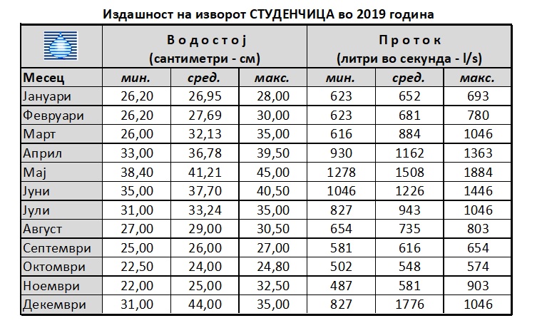 Измерените податоци за издашноста на изворот и за водостојот во текот на сите месеци од 2019 година може да се видат на оваа табела.