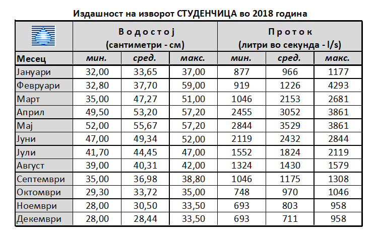 Табеларен преглед на минималните, средните и максималните вредности на водостој и проток на Каптажа за 2018 година.