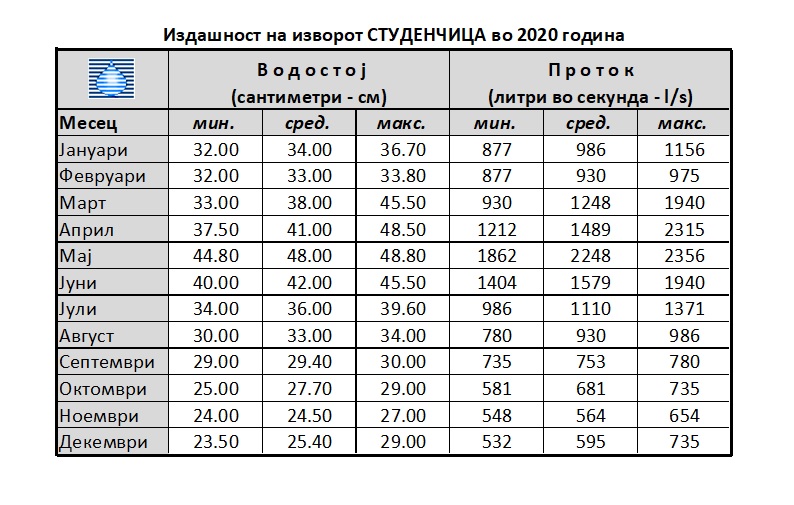 Измерените податоци за издашноста на изворот и за водостојот во текот на сите месеци од 2020 година може да се видат на оваа табела.