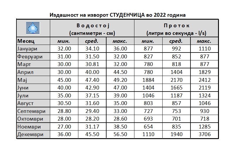 Измерените податоци за издашноста на изворот и за водостојот во текот на сите месеци од 2022 година може да се видат на оваа табела.
