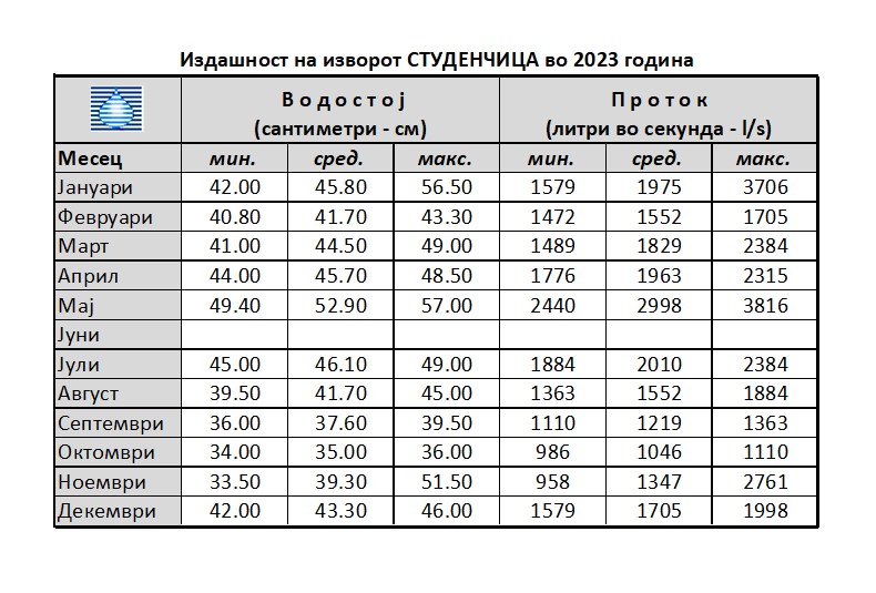 Измерените податоци за издашноста на изворот и за водостојот во текот на сите месеци од 2023 година може да се видат на оваа табела.