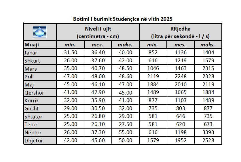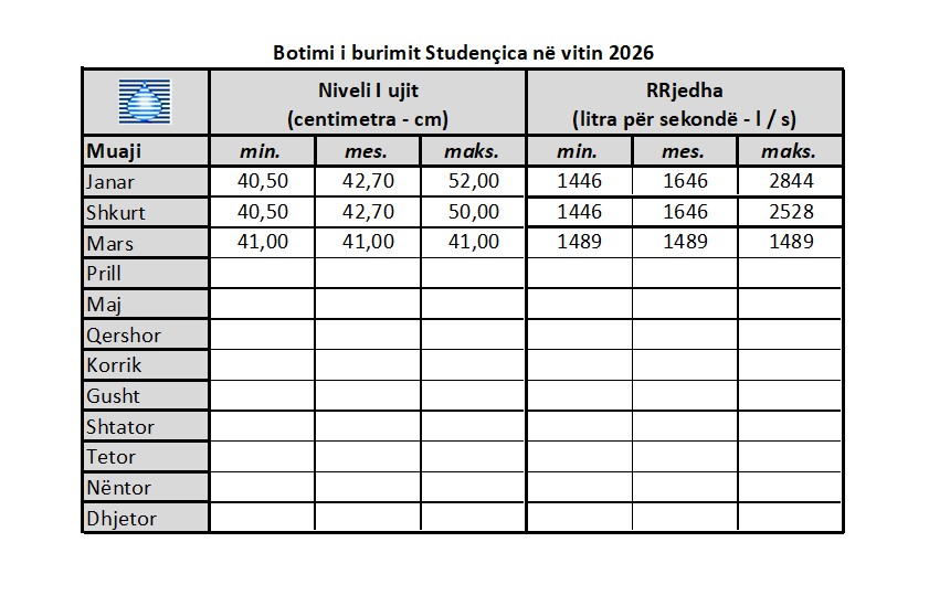 Të dhënat e matura për dendësinë e burimit dhe nivelin e ujit gjatë gjithë muajve 2026 mund të gjenden në këtë tabelë.